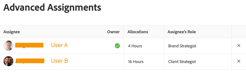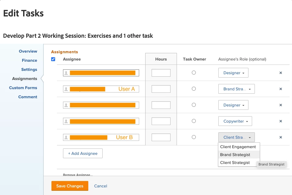 - "User B" with a Client Strategist role is added to the tasks to provide support to the Brand Strategist.