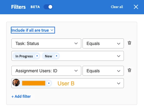 - Created a project filter to only show tasks that were In Progress or New PLUS that had the Assignment User = "User B"