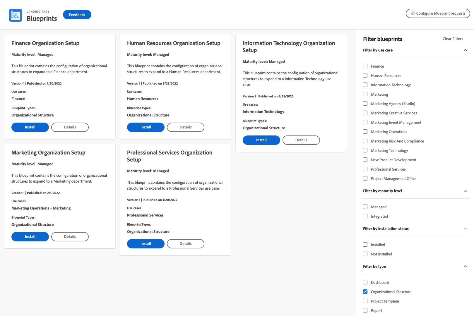 If you have feedback about Blueprints capabilities or about the solutions we are providing through the Blueprints, use the Feedback buttons available in the Blueprints area of Workfront instead of commenting here. We absolutely want to hear your input, especially regarding the solutions you would like to see in the catalog.