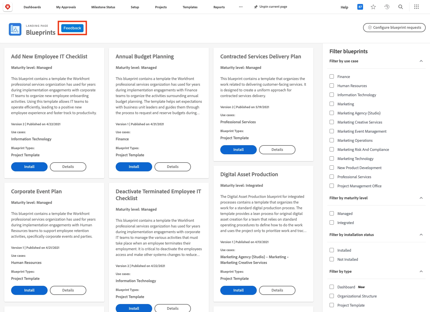 If you have feedback about Blueprints capabilities or about the solutions we are providing through the Blueprints, use the Feedback buttons available in the Blueprints area of Workfront instead of commenting here. We absolutely want to hear your input, especially regarding the solutions you would like to see in the catalog.