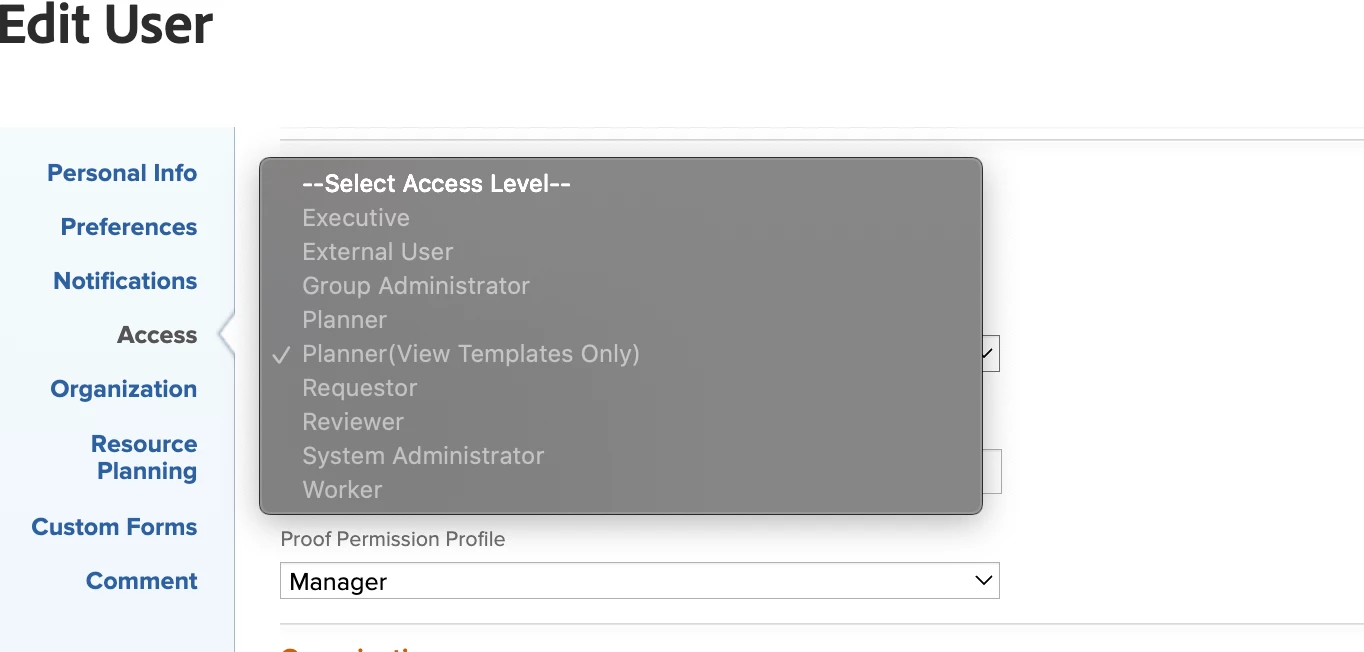 EDIT: This appears to be an even stranger issue than I initially though. It appears to affect all admin-level users. I am even unable to change my own access level. And it appears that the ticket submission is messed up, as I am unable to open a Workfront ticket, because it isn't an option to select...