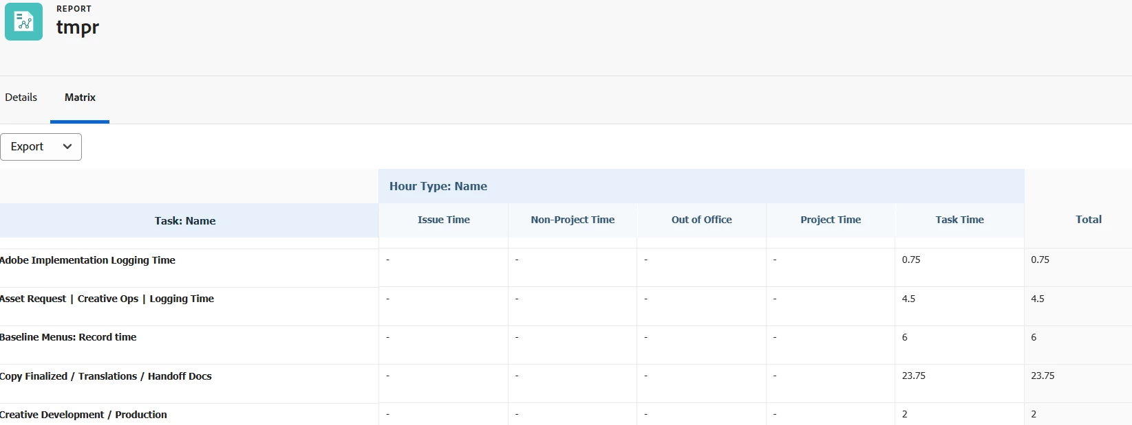 For instance we use Task time and Support Time. when i pull a Task report i want to know if only Task time, only Support time or if both Task and Support time were logged on that specific Job.
