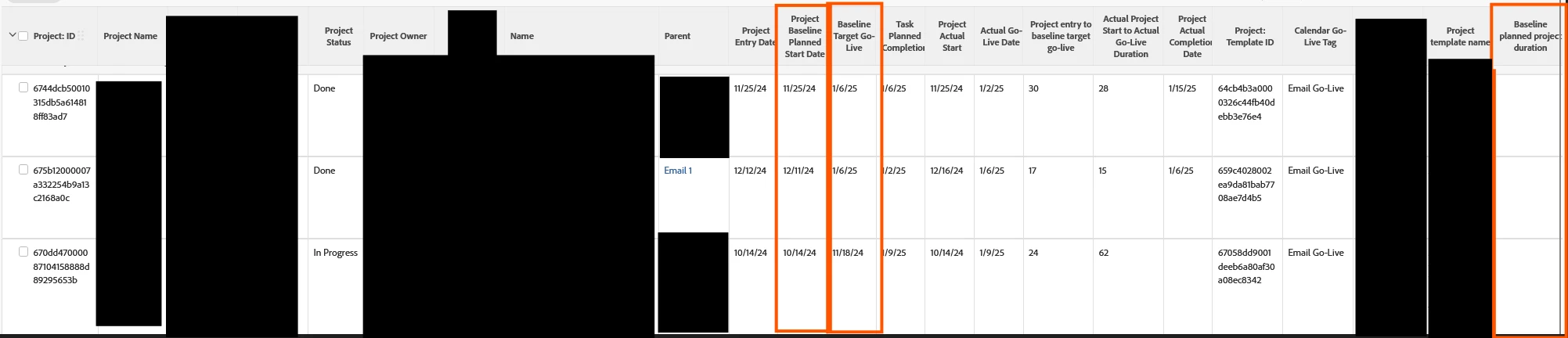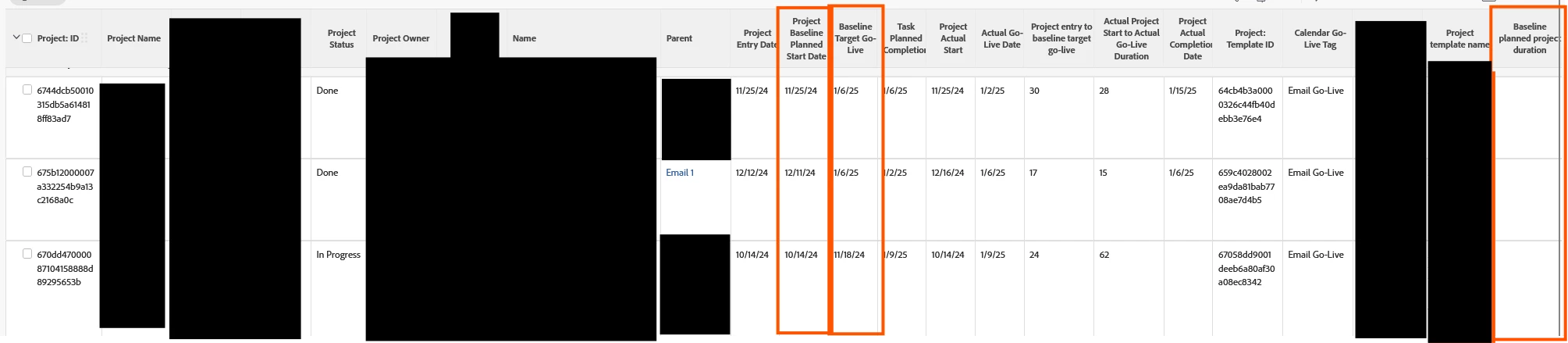 Trying to see how long the duration should have been when the project was created/baselines were taken - Project start to go-live task completion . I have read forums and guides but cannot figure out why this is showing up with no data.