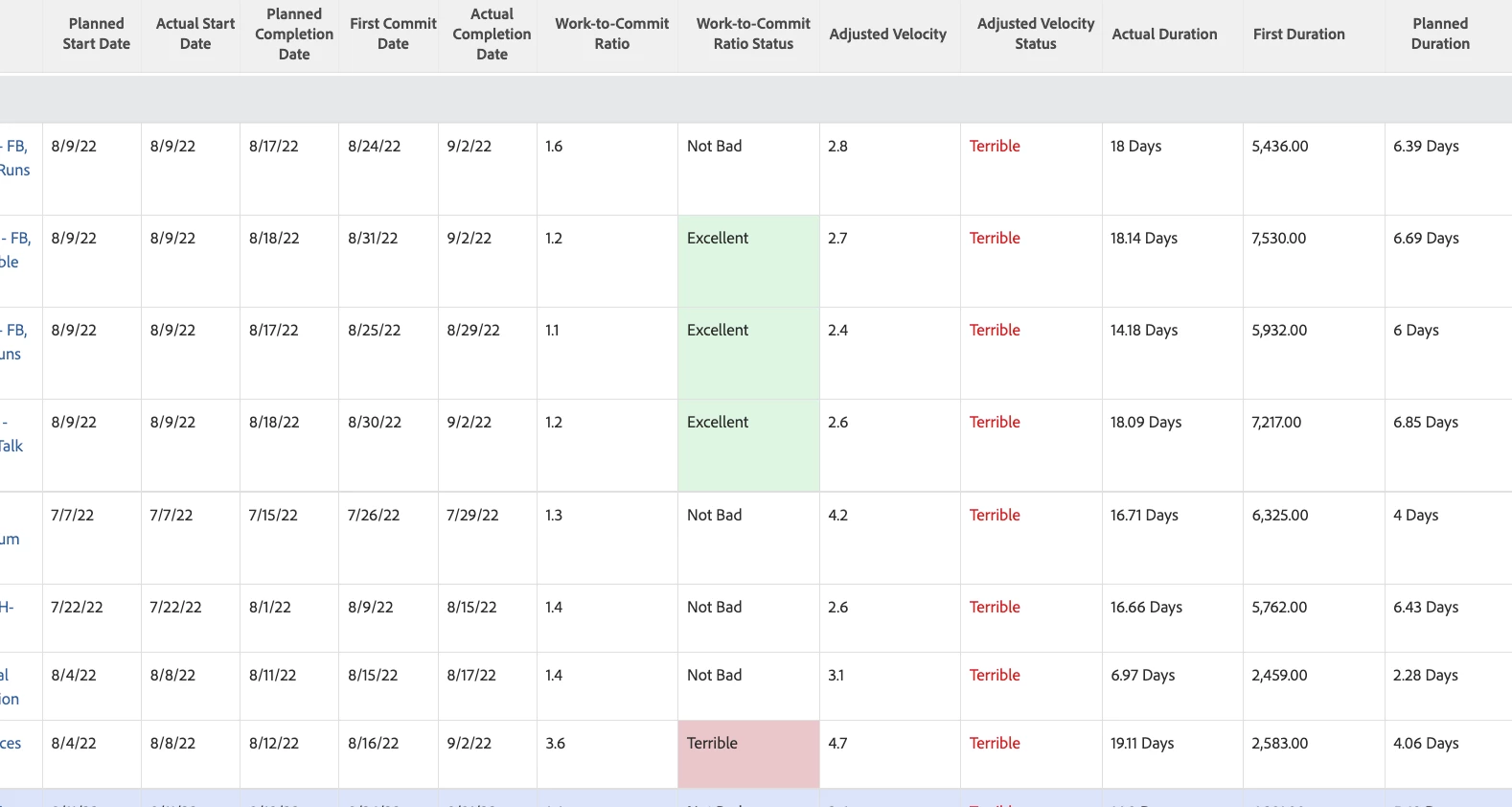 I am following Example of Velocity Reporting, August 14, 2019 - so, a lot of calculation - planned vs actual vs baseline (first duration) - but it doesn't display number of days or hours - calculations are working but I can't explain what is being pulled in reality