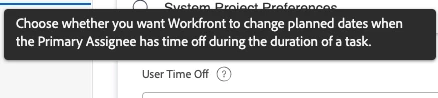 We don't use this setting either (ignore time off) bc we don't have the luxury of modifying a schedule based on resource availability, we put a different resource on it. In terms of it shifting after a project is created, I've found that it if you do have the setting to consider time off, it only considers it at time of project creation and IF the users have the time off already in place in Time Off. After it's in Current, say someone then adds Time Off during when they have tasks due, I haven't found it slides those existing task due dates. But if they log time off and THEN you create a project with tasks during that timeframe, the dates will move around it.