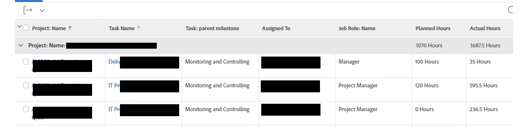 The planned and actual hours for all the tasks my team (per team member) worked on (actual hours) last week. I want to group it by Project Name.