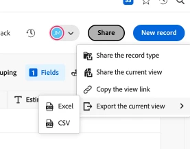 Additionally, once you are inside an operational record type, clicking the ‘Share’ button will give you the ability to: share the record type, share the current view, copy the link view, and export the current view. If you would like to export the current view, you can export it as either an Excel or CSV.