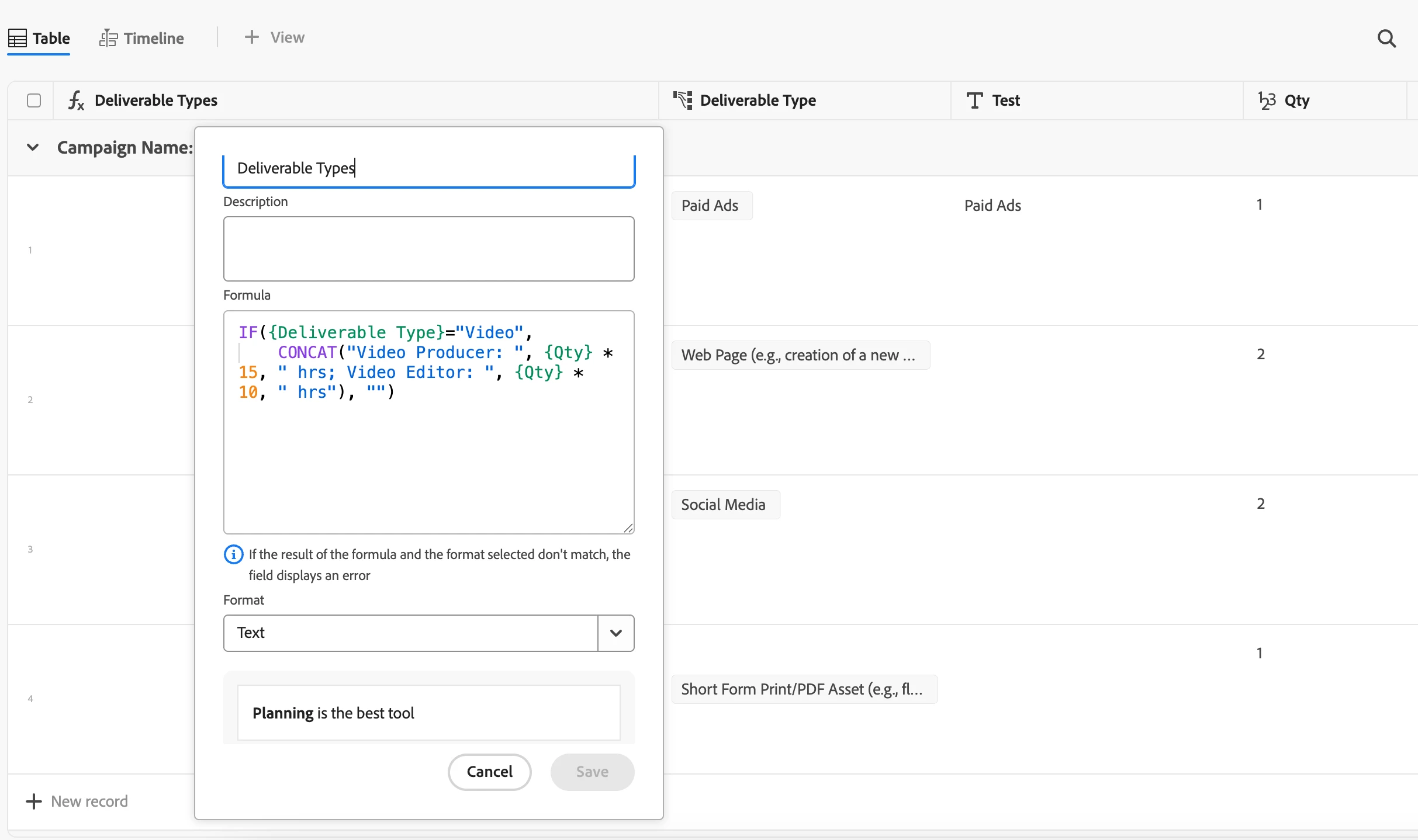 Workfront Planning is recognizing this as a valid formula but it's not returning anything after I click save. What does work is if I were to switch {Deliverable Type} to a free text field and type in Video.