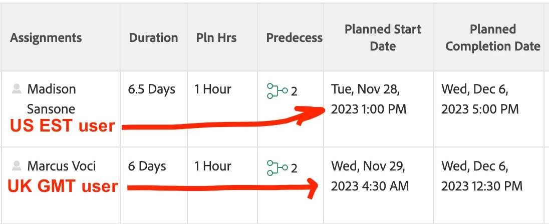 Currently, Workfront utilizes the time zone on the user's computer to determine the times and dates for tasks versus the setup time zone within Workfront for the user. We are finding issues with this in a few locations within Workfront. For example, in the Time Off section, if the user's setup time zone within Workfront is not set to the same time zone as their computer, it will select 2 days when trying to select 1. Another example, if a user is located on the West coast and their computer is set to PST, but their Workfront time zone is set to EST, it will override the EST and use the computer's time zone. This is especially difficult for Planners that are setting up due dates and times for tasks within a project. We'd like to set all users to EST, regardless of where are they are located in the world.