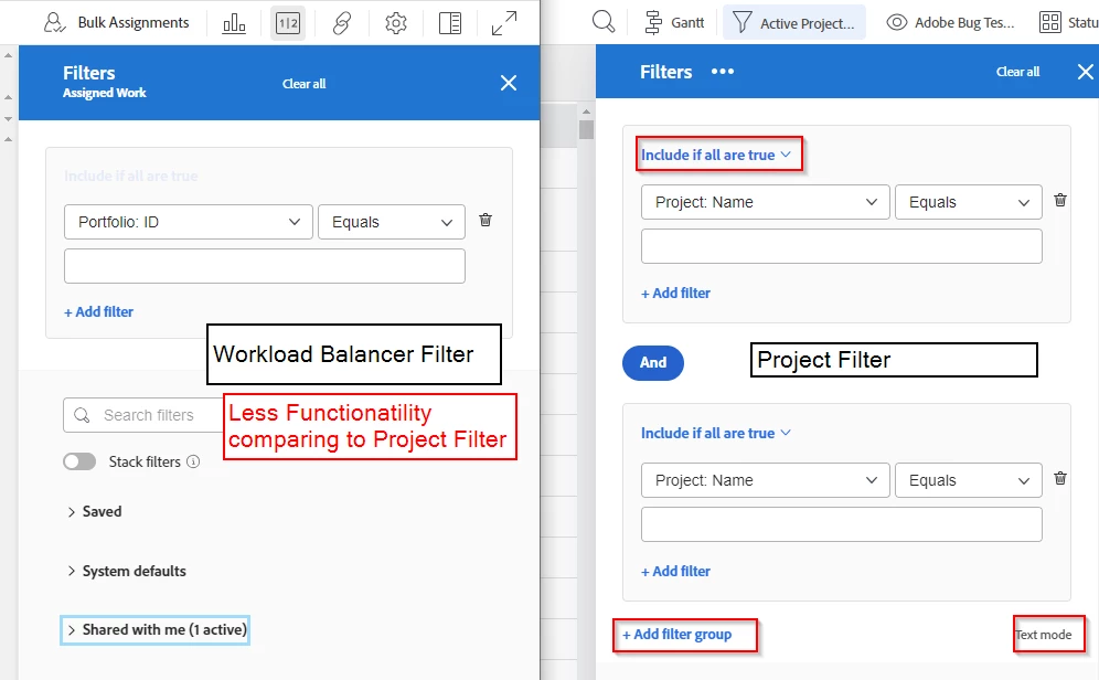 The current 'Filter' in the Workload Balancer has limitation for the following functionalities whereby these are available in other objects type such as Projects, Tasks, and Requests.