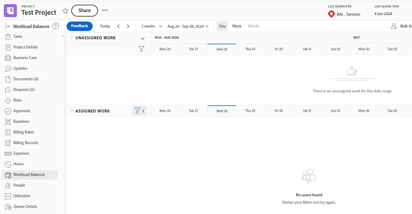 We are trying to assign tasks on a project in Workfront. When we go into the Workload Balancer, we are expecting to see users available to us so that we can assign a task.