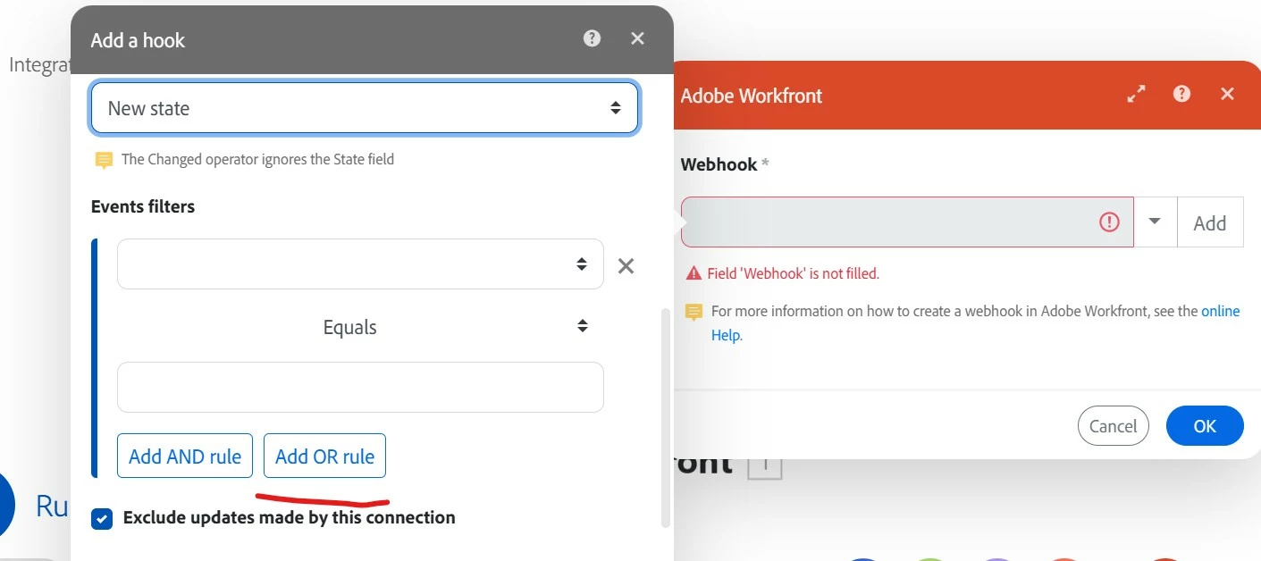 Adobe Workfront allows for setting up complex webhook trigger conditions, including "OR" comparison. This allows for triggering webhooks for cases like "Field 1 OR Field 2 Changed".