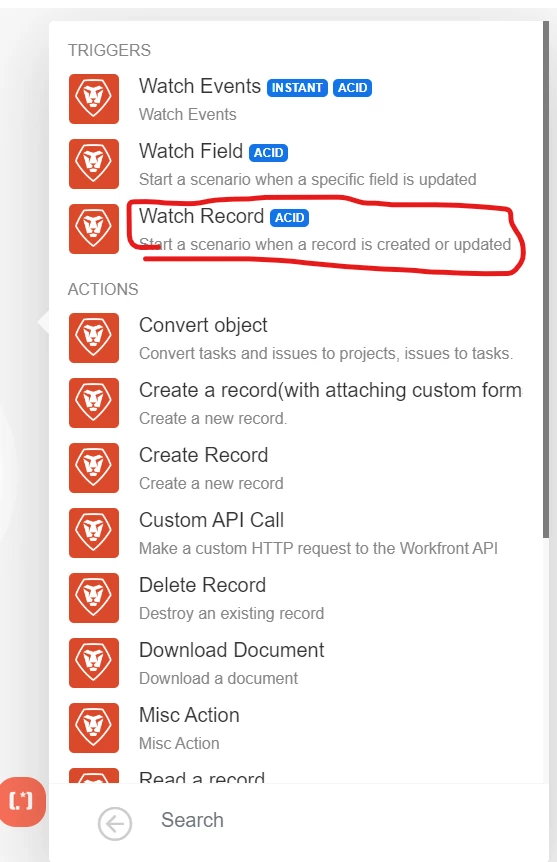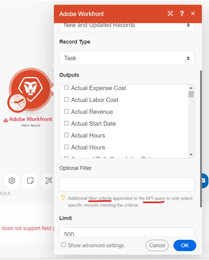 I am working on configuring module in Fusion -"Watch a record", want to add & use optional filter for filtering only specific records meeting the criteria using API query. Tried adding API query but receiving error - "The operation failed with an error. [422] APIModel V17_0 does not support field property (Task)".