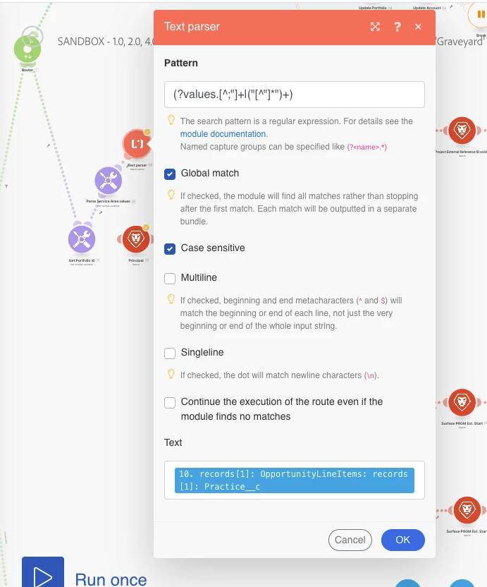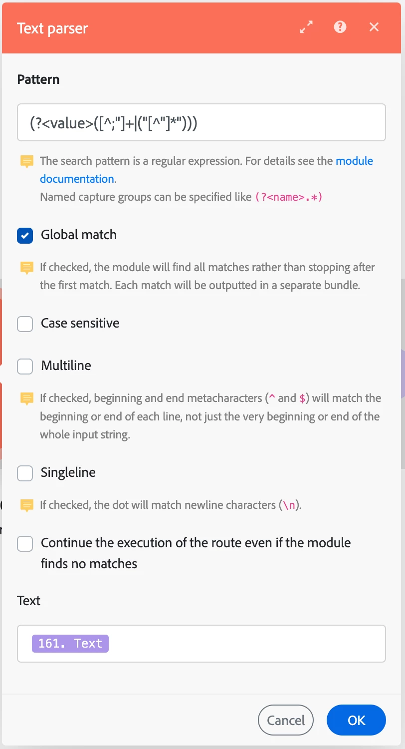 Lars, this is what I got when using Text Parse Match Pattern: