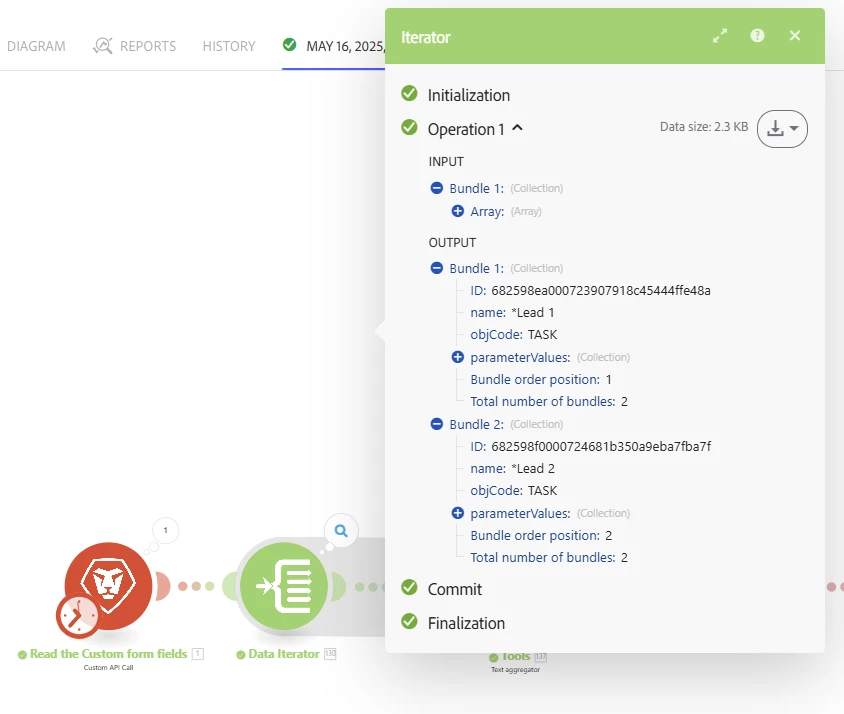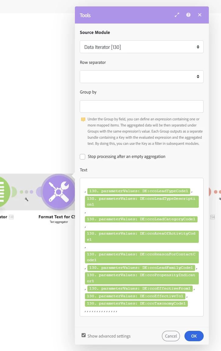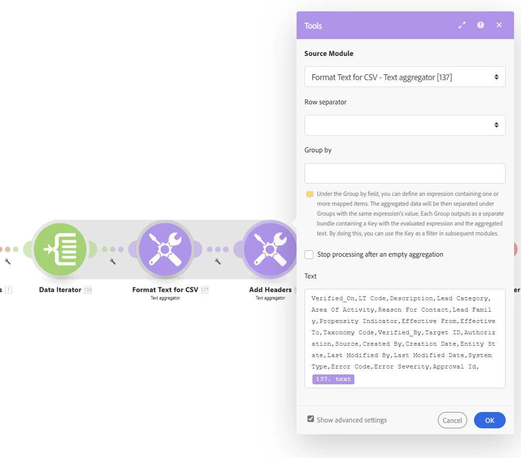 I need to compile field-level data from multiple tasks and add it to a CSV file. The issue I’m facing is that the data is arriving in separate bundles, whereas I need it in a single bundle to correctly position the fields in the CSV, ensuring they appear in the right order and row.