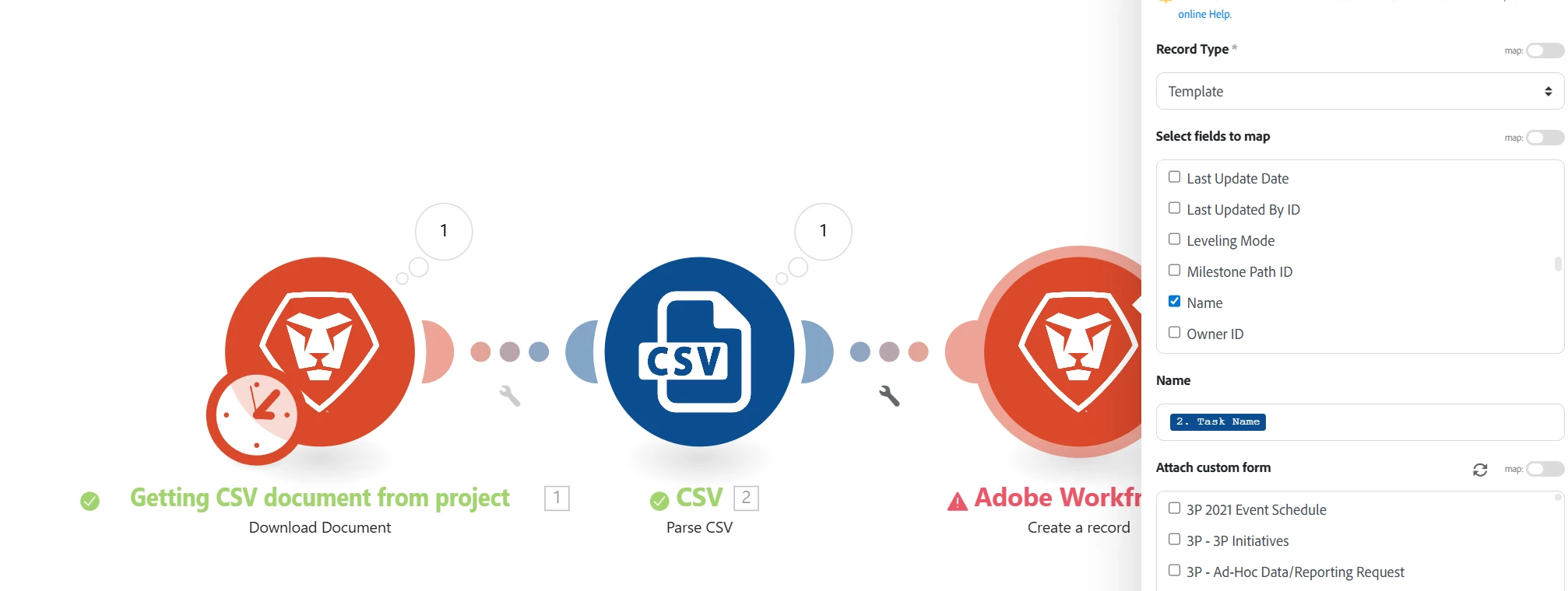 Hi, I am trying to create a template via a csv file in Fusion. I used the template that Fusion provides to create a project, but change it to create record Template. I am stuck at the point where I need to map the columns to the according fields.