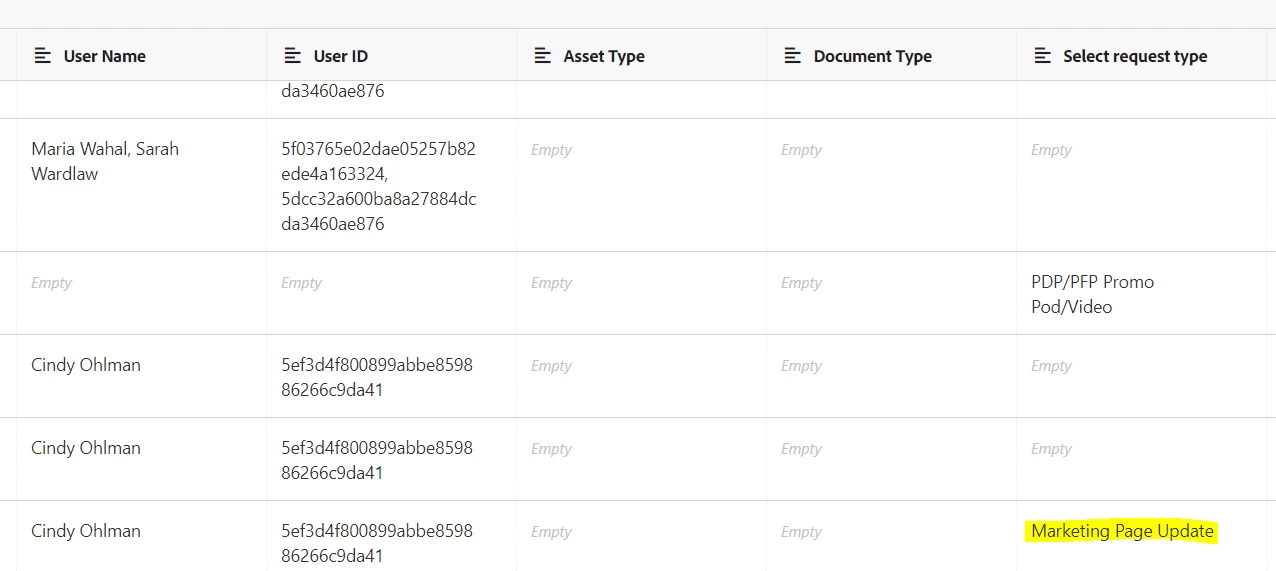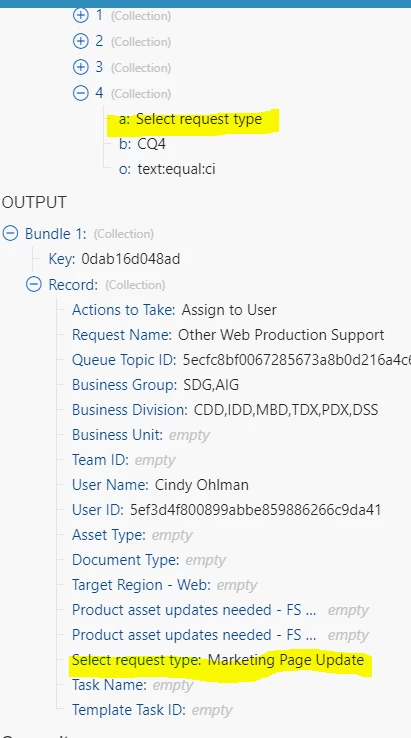I have about 50 entries and my newest one is causing issues. None of the others are routing incorrectly. This scenario should route to the user when, among other things like specified business division, etc, Select request type is Marketing Page Updates