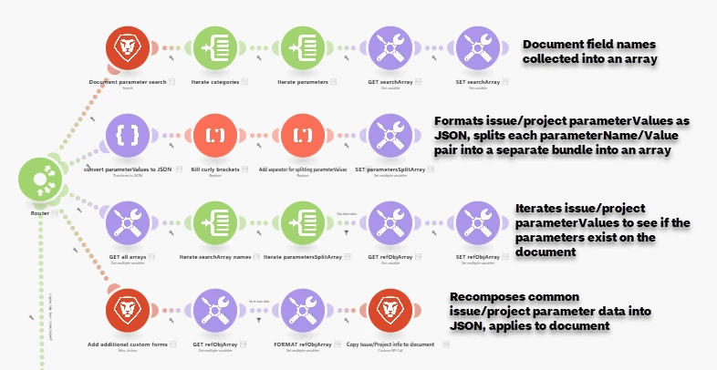 I'm working on an automation which determines all common paramterValues between an issue an a document. When it has its list, it plops the list into the output field of a search module and pulls those exact fields.