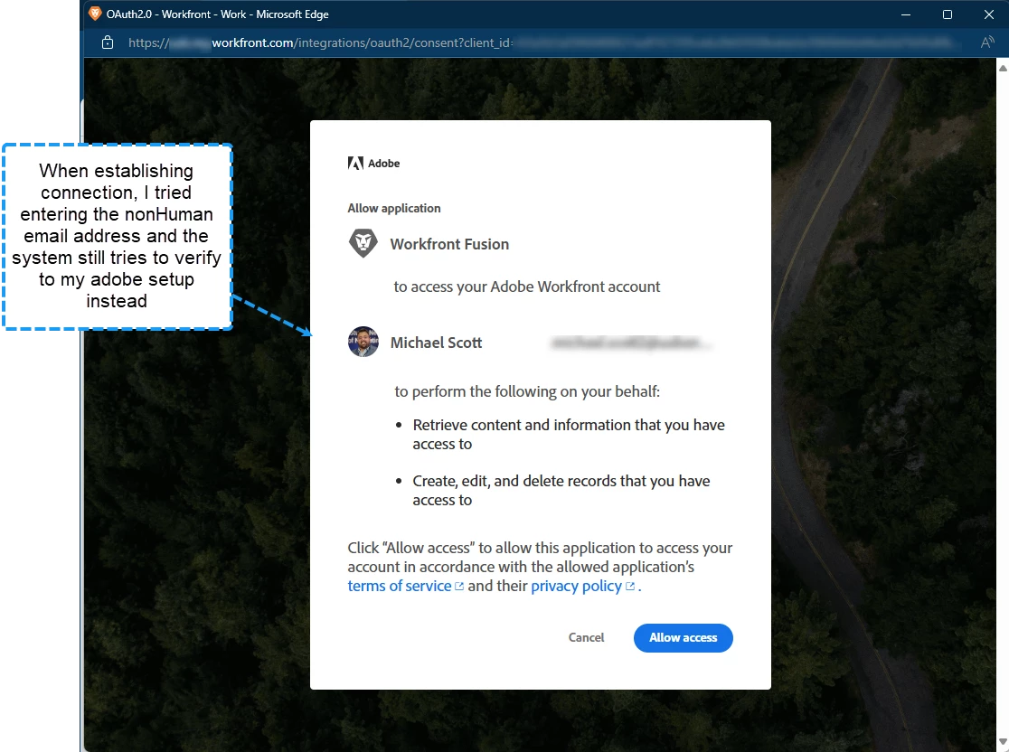 Previously, we were able to establish a "user" connection with a randomly created nonHuman ID/email address. We were able to in Workfront settings click on the Log In As for this user, then go into Fusion and set up a connection using the nonHuman User account. This appears to no longer work and wondering what the solution is to establish a connection to run fusion automation. When we recently went in to fusion due to what appeared to be connection issues last Friday, we revalidated the previous connection, but now it is established with my user connection which we are not looking for. Additionally, at my organization we do not have the option to go into any incognito modes or anything to potentially try and bypass auto sign on.
