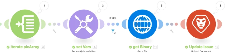 The AirTable module (like Planning) provides a Pictures[] array that contains URL paths to related images for a record. In the example below I had three pictures attached to one AirTable record.