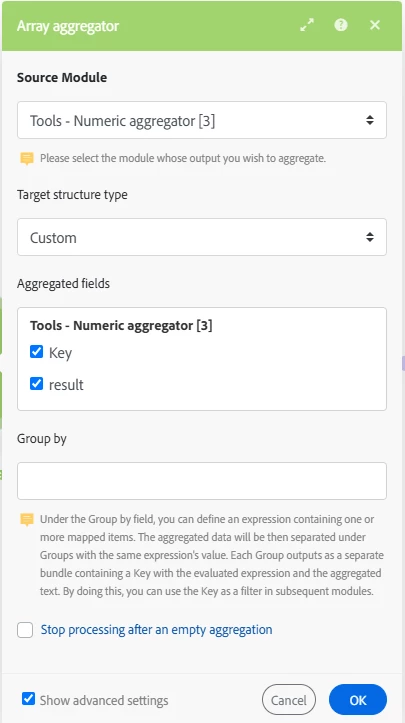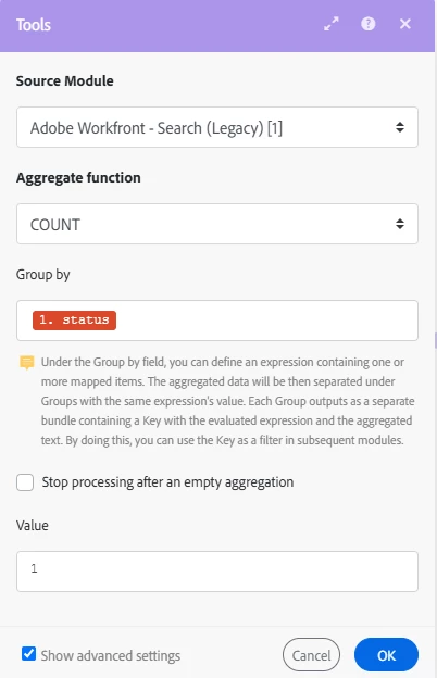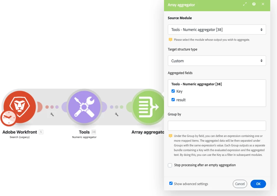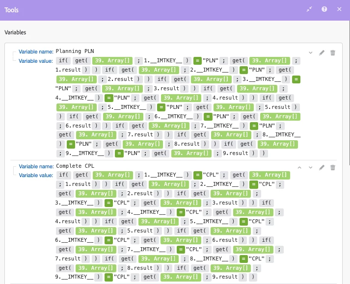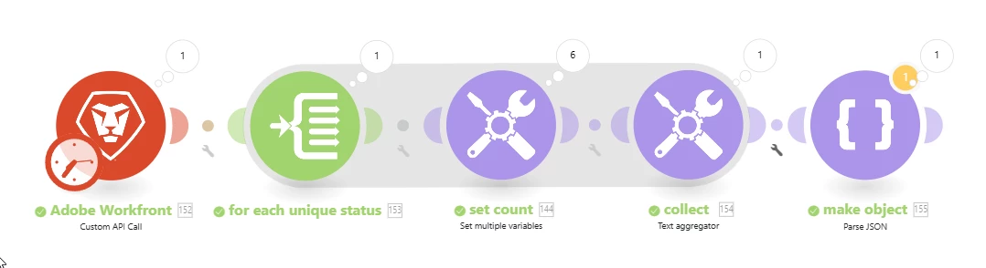 I am searching for a list of projects, then using a numeric aggregator module to get the number of projects in each status (this works perfectly). The aggregator module gives me an array of collections, with each collection containing Status and the count. Then I use an Arrar Aggregator module to combine all the statuses and counts into a single array. Finally, a Set Multiple Variables module will be used to set the count of each status to a matching variable that can be used in the workfornt update call. The Set Multiple Variable is where empty values are recorded intermittently.