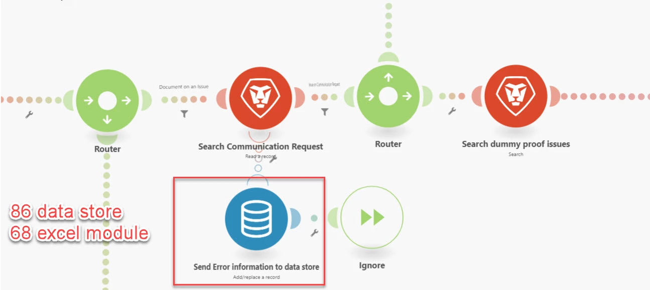 What I'm thinking of doing is retiring the data store (considering it only exists within the one team). I'm going to replace all the data store modules with Excel modules, have the info go right there, and have Fusion do all of the info gathering from the Excel sheet.