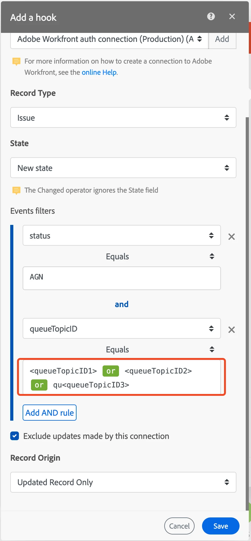 AND QueueTopicID EQUAL {{"queueTopicID1" | "queueTopicID2" | "queueTopicID3"}}