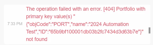 However, we received an error saying The operation failed with an error. [404] Portfolio with primary key value(s) "{"objCode":"PORT","name":"2024 Automation Test","ID":"65b9bf100001db03b2fc7434d3d63b7e"}" not found