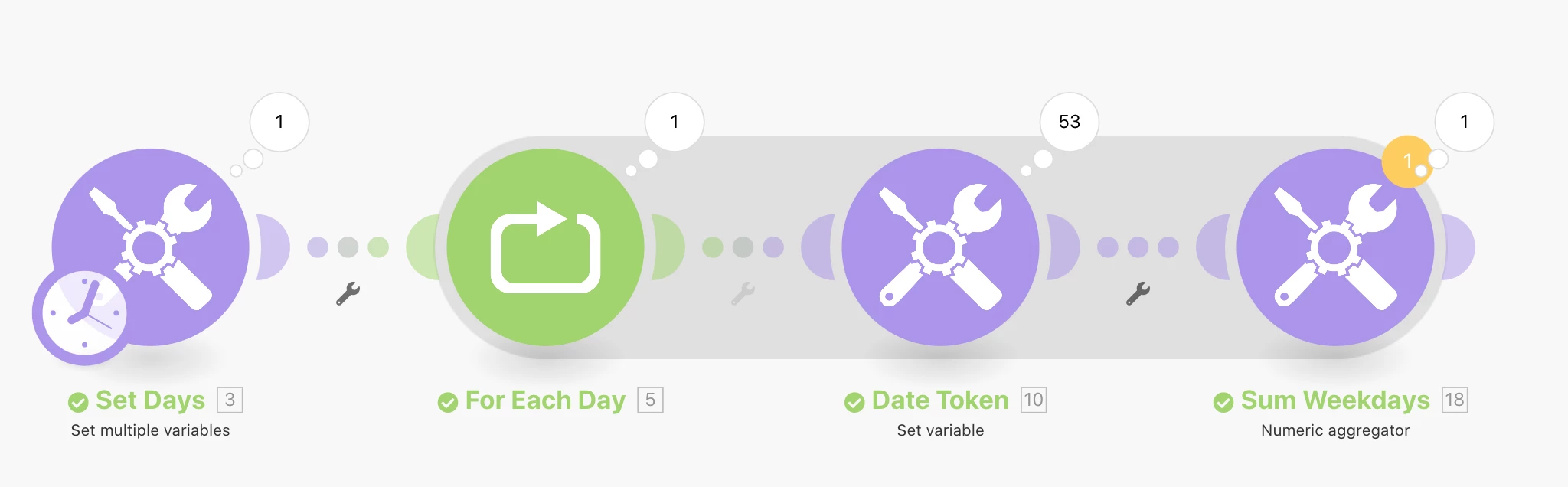 If you have access to Google Sheets, then you can think of it as a very powerful calculation API. In this case, you could send the two dates to a 3-cell row that uses the NETWORKDAYS function to return the value that you need in the format that you want. ~Jeff