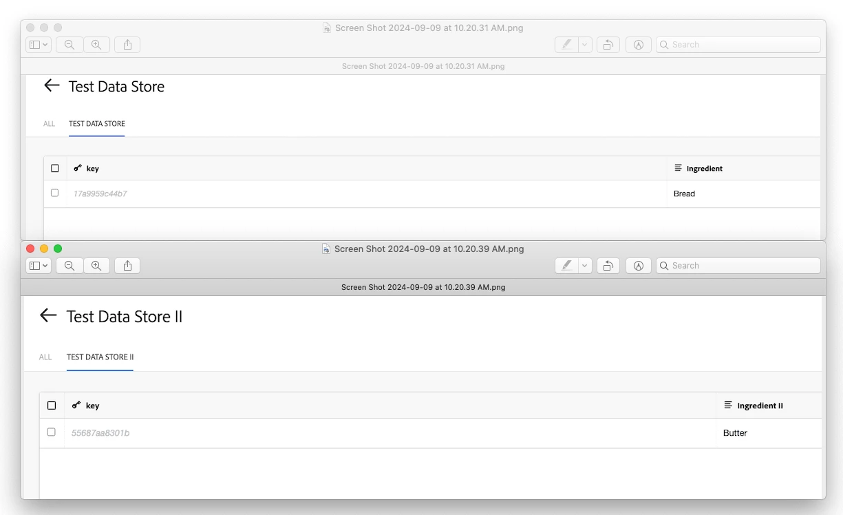 I have 2 data stores. I start each run of the Scenario by clearing both of the stores. As the Scenario progresses thru various API calls, the data starts to take on the following structures: