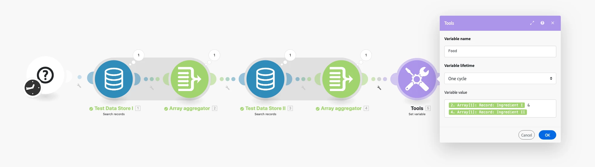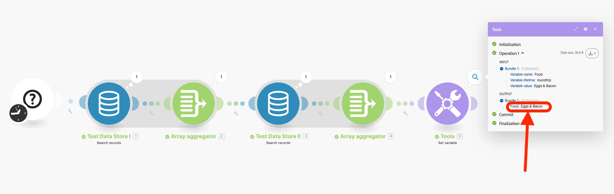 However, since I clear all data stores at the beginning of the scenario, every time I initially search Data Store B during each iteration to see if there is already a value in the concatenated string column that I can append to, since it's always initially empty, the iteration ends. I don't ever get the option to ever write "eggs" to the store because it never gets to that module.