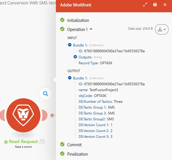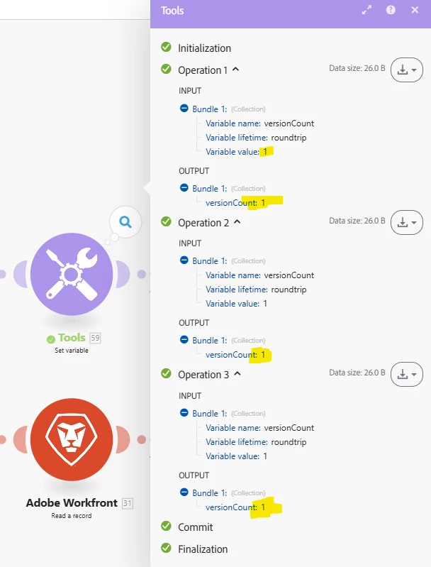 But output of the module#59 is always the first value for all operations and ignoring the subsequent values. In this example, please refer the module #59 output in the below screenshot,