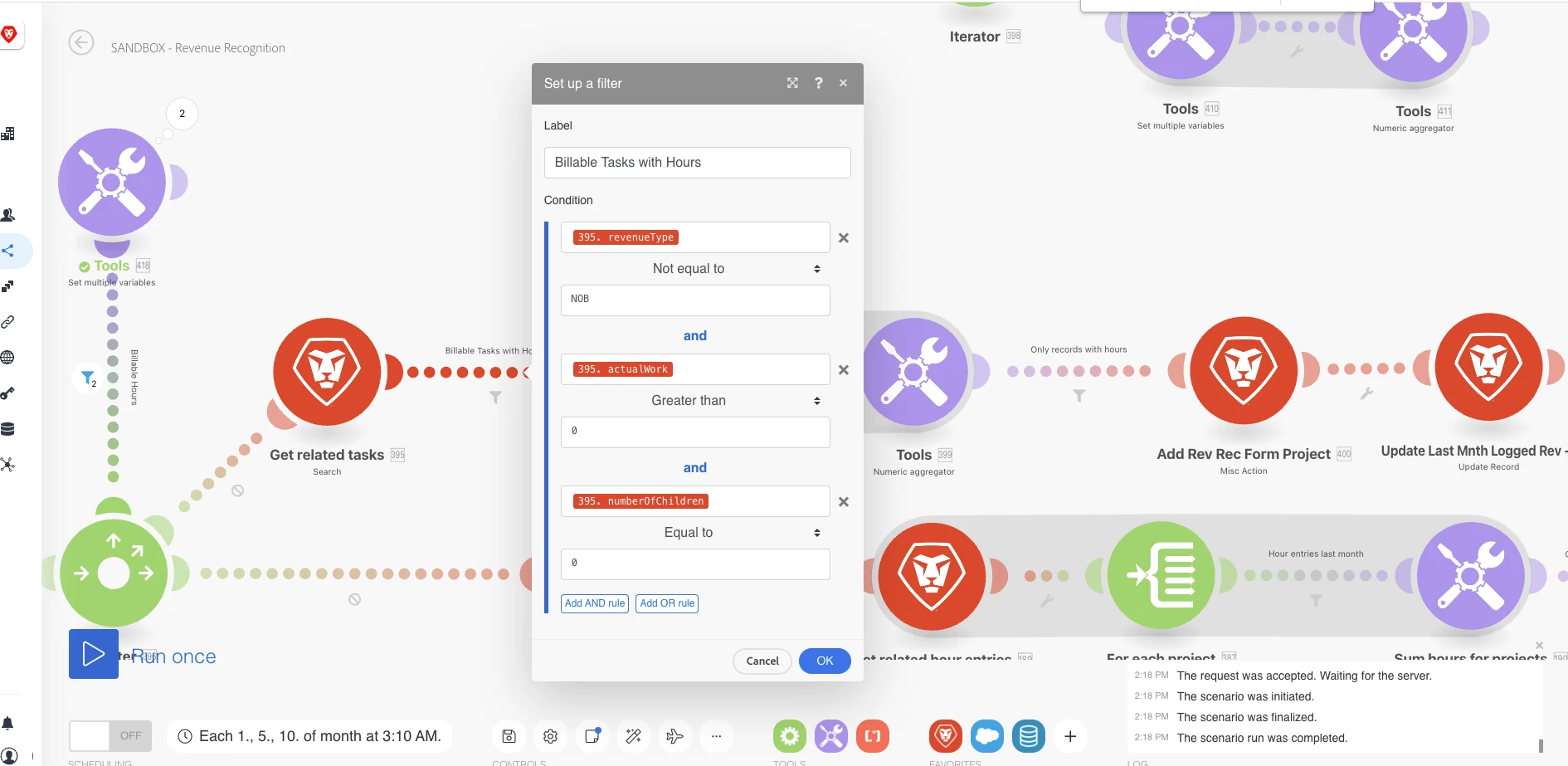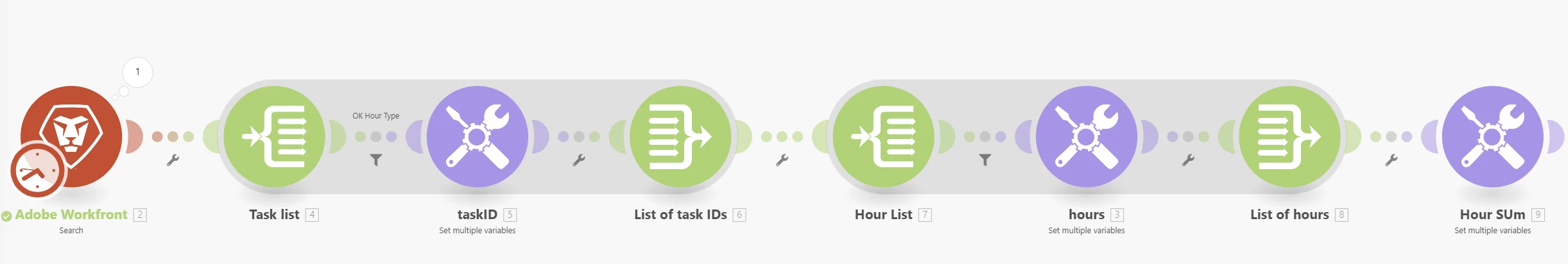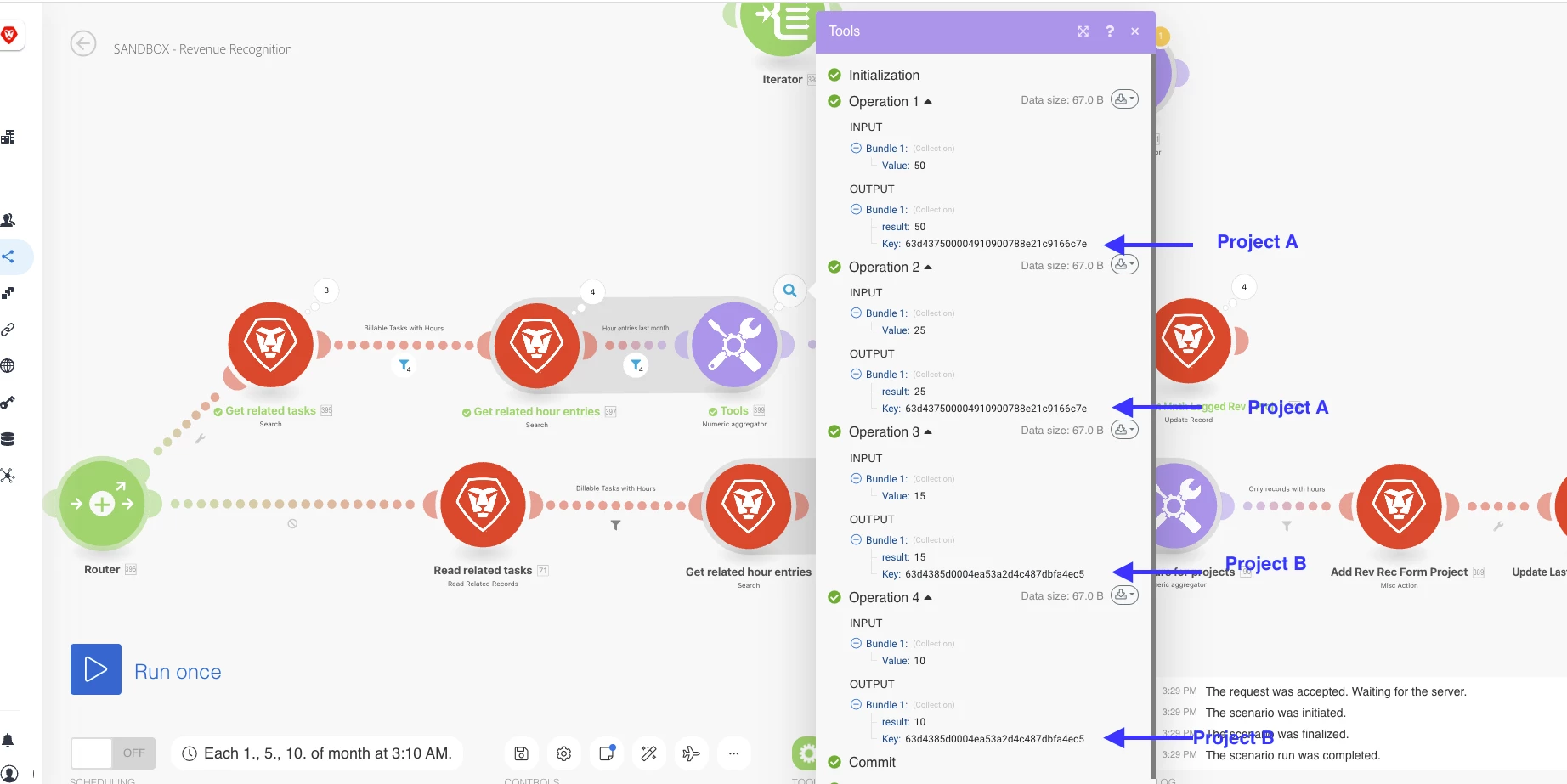 I'm trying to build a path that looks at all of the hour records from tasks belong to various project, and aggregate the sum hours at the project level (in a custom field called Last Month's Revenue Hours).