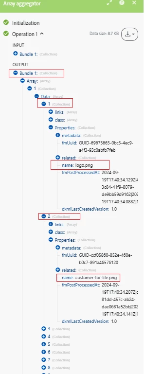 If you are just interested in, for example, the logo.png value, you would need to include get(array;1.Data.1.Properties.name). If you are wanting to iterate thru all of the "Data" objects, you need to iterate thru Array and then iterate thru Data, then you can just use Properties.name.