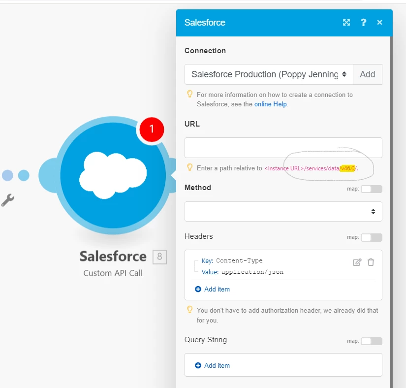 When I open the Salesforce Custom API Call module the endpoint is set to "Enter a path relative to <Instance URL>/services/data/v46.0/."