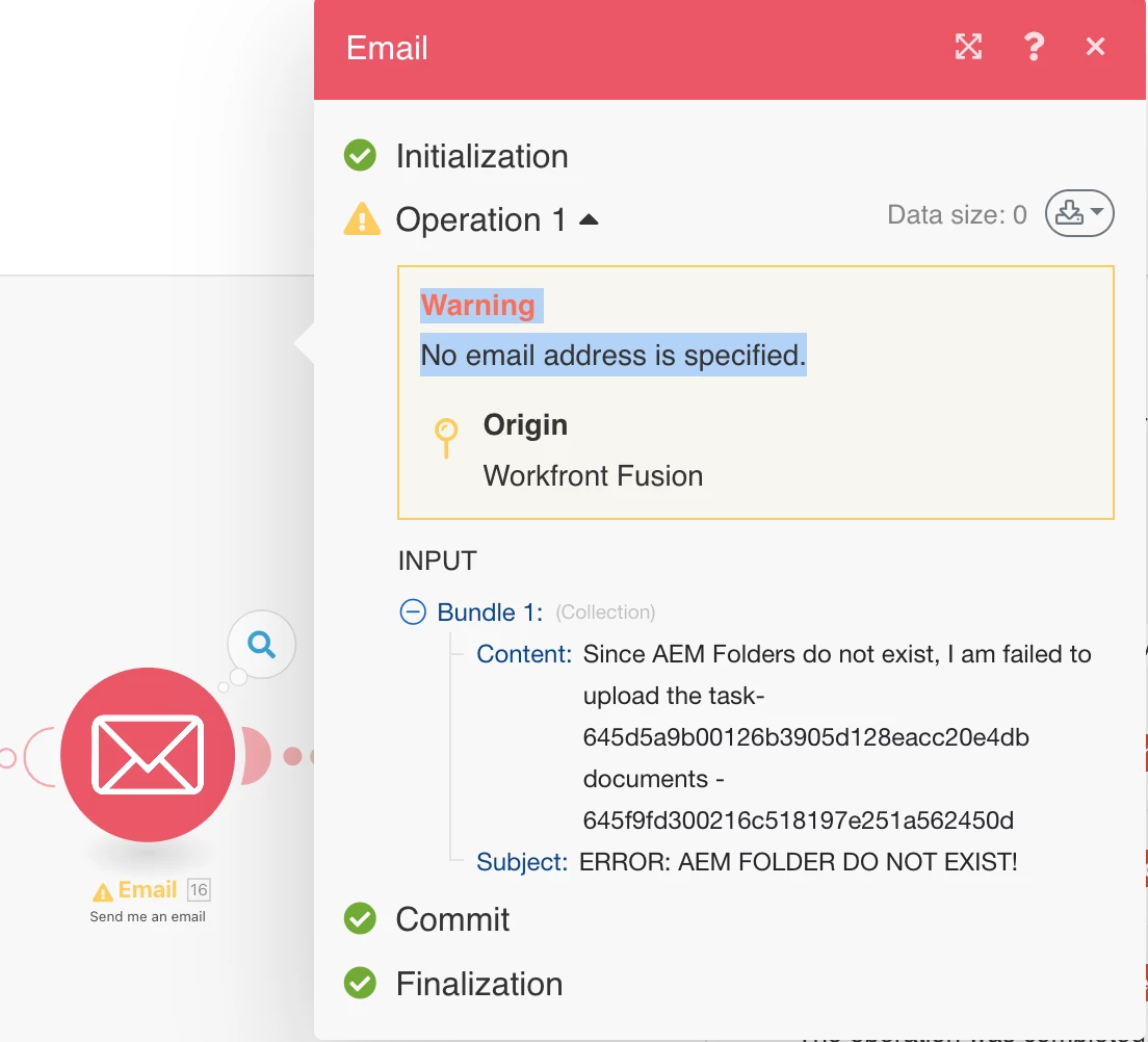 Send me an email module in Fusion does not have a configuration to provide email address and it is failing with the below error. Appreciate any help.