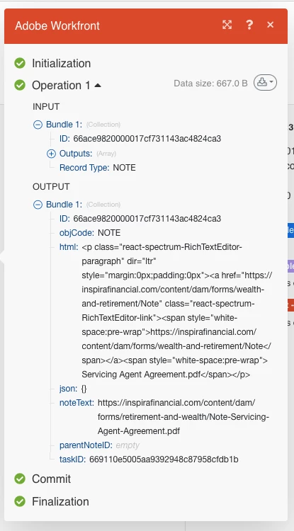 I designed a scenario to update task comments in Workfront, by updating Note record, setting new noteText. However, despite it being changed, Workfront still shows old text. I figured it is comming from html property, this one didn't get set automatically. I tried setting it manually with same update record module, it doesn't work. Is there some other way of updating task comment?