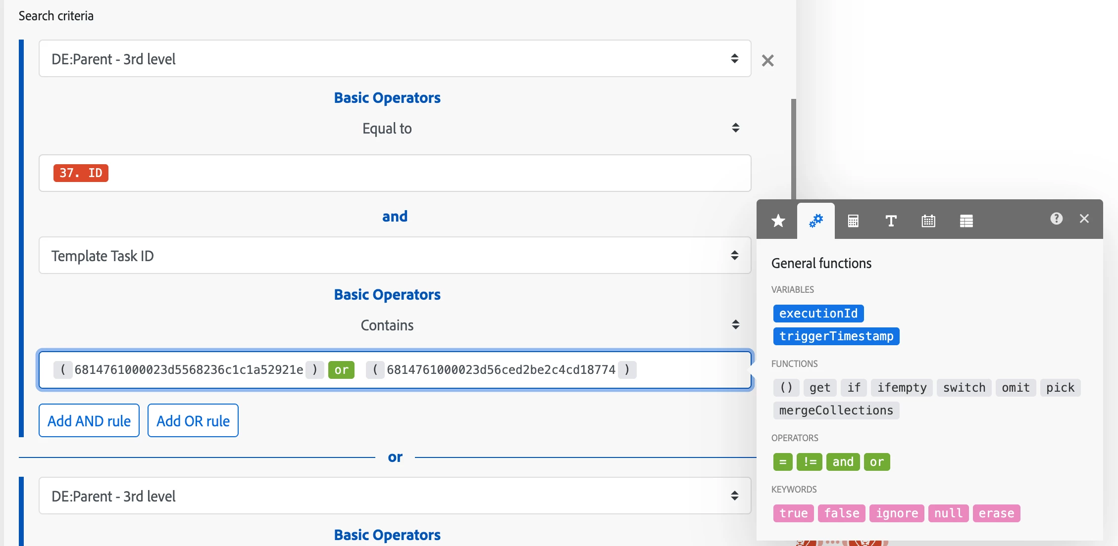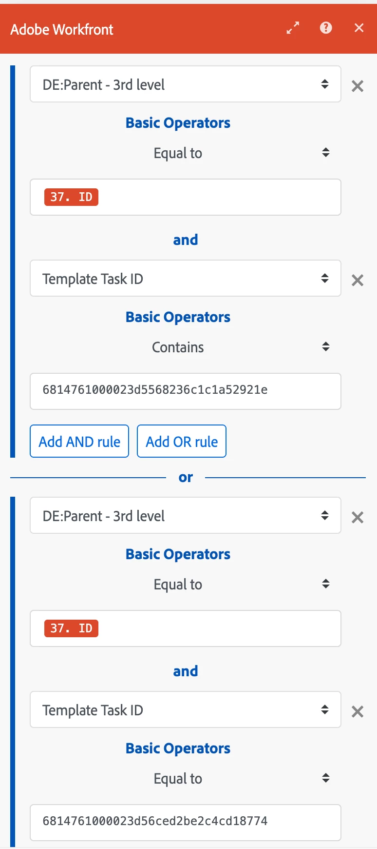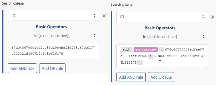 2. But as this is the same object and just to different values, we would like to combine this using the 'OR-statement' like seen in the screenshot directly below. However, this config in Fusion returns an error.