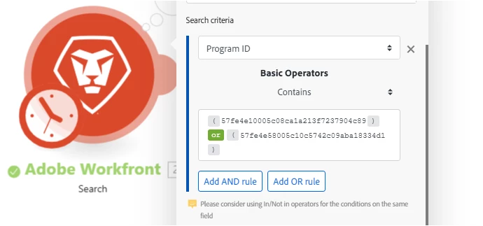 Using operators in search criteria of a Fusion module